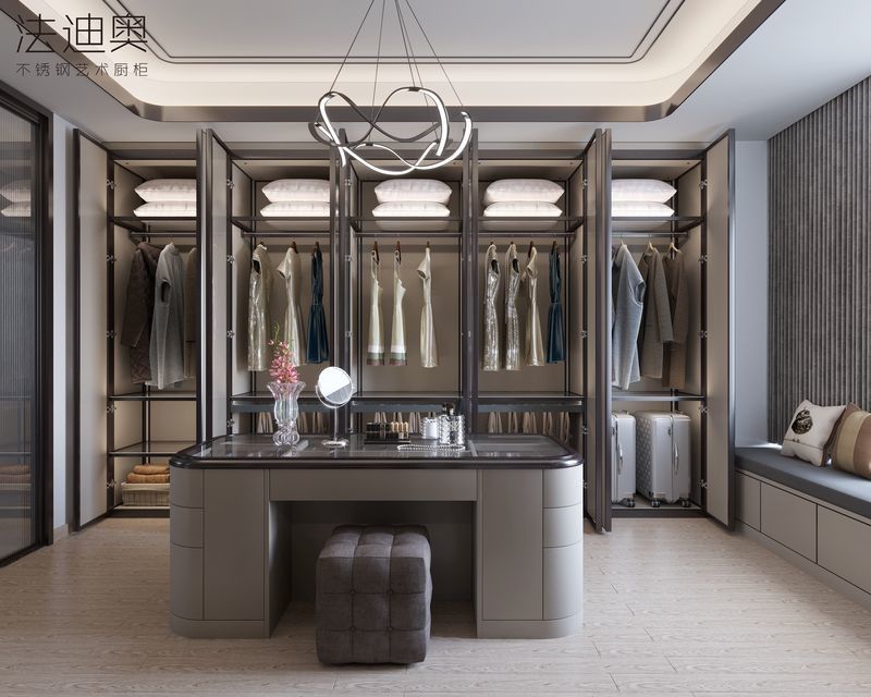 Ta garderoba jest prezentowana jako system oparty na projektowaniu, a nie jako generyczny SKU. Wykorzystuje kontrolowaną paletę wykończeń w połączeniu z konstrukcją szafek ze stali nierdzewnej Premium, aby stworzyć bardziej spójną tożsamość wizualną dla projektów premium mieszkalnych.