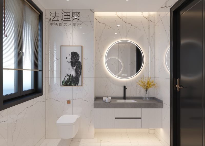 Ta szafka łazienkowa jest prezentowana jako system projektowy, a nie jako generyczny SKU. Wykorzystuje kolor biały/czarny w połączeniu ze stalową konstrukcją szafki, aby stworzyć bardziej spójną tożsamość wizualną dla projektów premium w budownictwie mieszkaniowym.