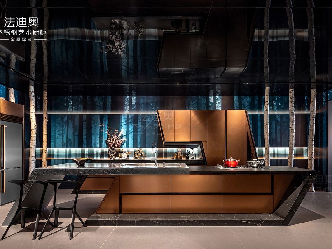 Ta niestandardowa szafka kuchenna opiera się na zróżnicowanej strategii wykończenia: różowe złoto w połączeniu ze strukturą szafki ze stali nierdzewnej. Ta kombinacja zapewnia kupującym cieplejszy, luksusowy wyraz, nie tracąc przy tym łatwości czyszczenia i trwałości projektu, jakiej oczekuje się od szafek ze stali nierdzewnej.
