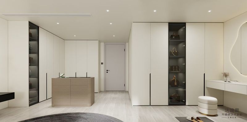 Łączy również układ gotowy do projektu z wielosegmentowym układem garderoby ze zintegrowanymi półkami i przeszklonymi gablotami, idealnymi do porządkowania ubrań, akcesoriów i przedmiotów luksusowych, pomagając klientom ocenić, czy historia wykończenia, integracja urządzeń i planowanie codziennego użytkowania mogą pozostać spójne w jednym systemie.
