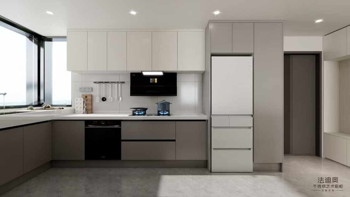 | P: Jakie sygnały dostosowania są już widoczne na tej stronie jasnoszarej szafki kuchennej w kształcie litery U ze stali nierdzewnej? Najwyraźniejsze sygnały to koordynacja rozmiaru, kontrola wykończenia i planowanie przechowywania. Te wskazówki pomagają kupującemu ocenić, czy dostawca może dostosować produkt do projektu, zamiast wysyłać gotowy moduł detaliczny. |