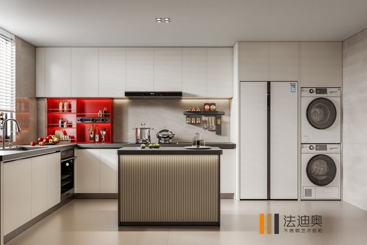 Te szafki kuchenne są prezentowane jako system oparty na projektowaniu, a nie jako generyczny SKU. Wykorzystują biel w połączeniu ze strukturą szafek ze stali nierdzewnej, aby stworzyć bardziej spójną tożsamość wizualną dla projektów premium w budownictwie mieszkaniowym.