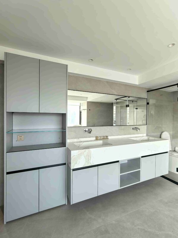 Ta próżność łazienkowa jest prezentowana jako system oparty na projektowaniu, a nie jako ogólny SKU.Wykorzystuje szarość wraz z strukturą szaf ze stali nierdzewnej Premium, aby stworzyć bardziej rozstrzygniętą tożsamość wizualną dla projektów mieszkaniowych premium.