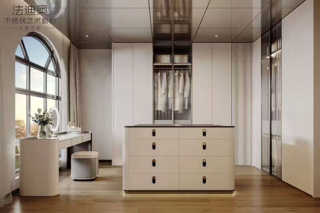 Ta garderoba jest prezentowana jako system oparty na projektowaniu, a nie jako generyczny SKU. Wykorzystuje biel w połączeniu ze strukturą szafek ze stali nierdzewnej, aby stworzyć bardziej spójną tożsamość wizualną dla projektów premium w budownictwie mieszkaniowym.