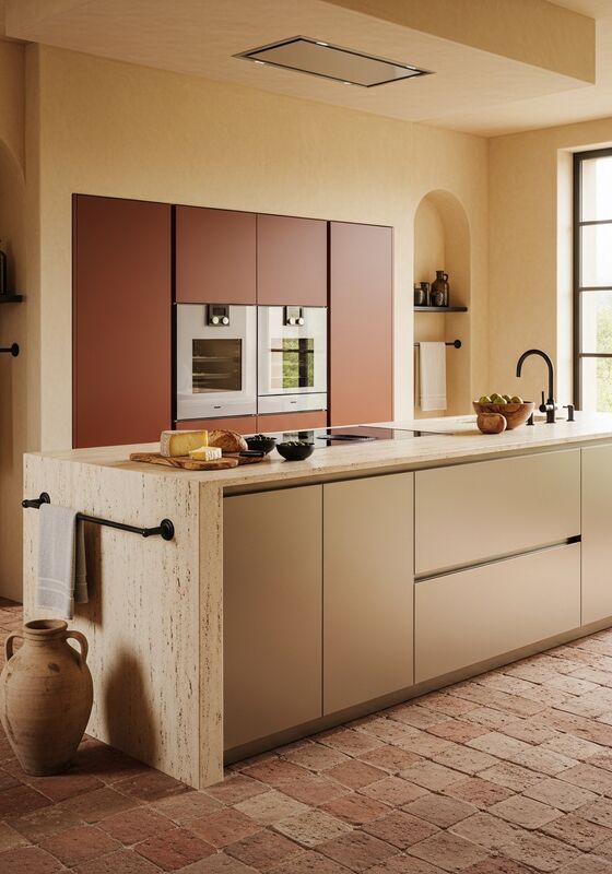 matowy lakier w odcieniu terakoty na wybranych frontach / blat z naturalnie szlifowanego trawertynu |