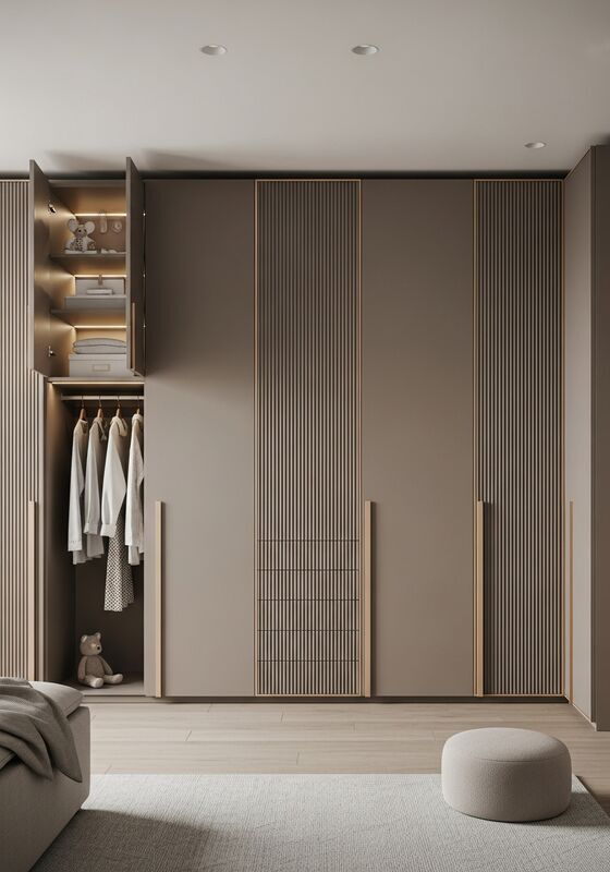 Fadior positions this kids room wardrobe as a project-grade solution built around 304 food-grade stainless steel with matte taupe powder coating (220°c baked), champagne gold pvd-coated stainless steel trim, steel-based wardrobe panels with matte taupe lacquer finish, and a matching stone or steel surface top for children's bedroom wardrobe for ages 3-12; suitable for clothing, toys, and keepsake storage in premium residential settings. This specification focuses on Matte mushroom-taupe lacquer finish on 304 food-grade stainless steel structure, Vertical micro-fluted panel doors at 15mm pitch for gentle shadow rhythm so designers, dealers, and project buyers can evaluate fit, finish, and delivery logic with less guesswork.