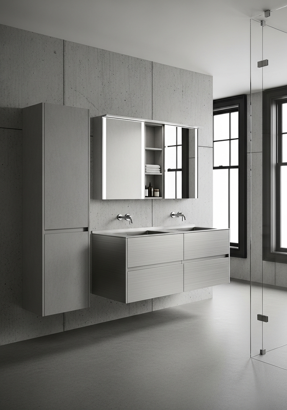 Fadior positions this bathroom vanity cabinet as a project-grade solution built around 304 food-grade stainless steel structural body; matte grey porcelain stoneware cladding on tall unit; integrated stainless steel countertop with folded edge construction, fine linear grain running horizontal, controlled matte sheen, industrial-precise, and a honed marble or sintered stone top for master bathroom vanity system for high-end residential, boutique hospitality, architect-designed interiors; suitable for humid environments, requires no sealing or re-finishing. This specification focuses on Brushed 304 stainless steel horizontal grain cabinet body with seamless welded corners, Matte grey porcelain stoneware tall storage unit with 3mm micro-texture concrete aesthetic so designers, dealers, and project buyers can evaluate fit, finish, and delivery logic with less guesswork.