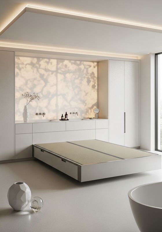 Odkryj więcej Powiązane systemyZobacz, jak łóżko tatami z pływającą platformą ze stali nierdzewnej z perłowym wykończeniem nanotechnologicznym łączy się z sąsiednimi systemami Fadior, aby uzyskać bardziej kompletne niestandardowe łóżko tatami lub specyfikację całego domu. Pierwszy link działa jako brama kategorii; pozostałe linki to systemy sąsiednie.