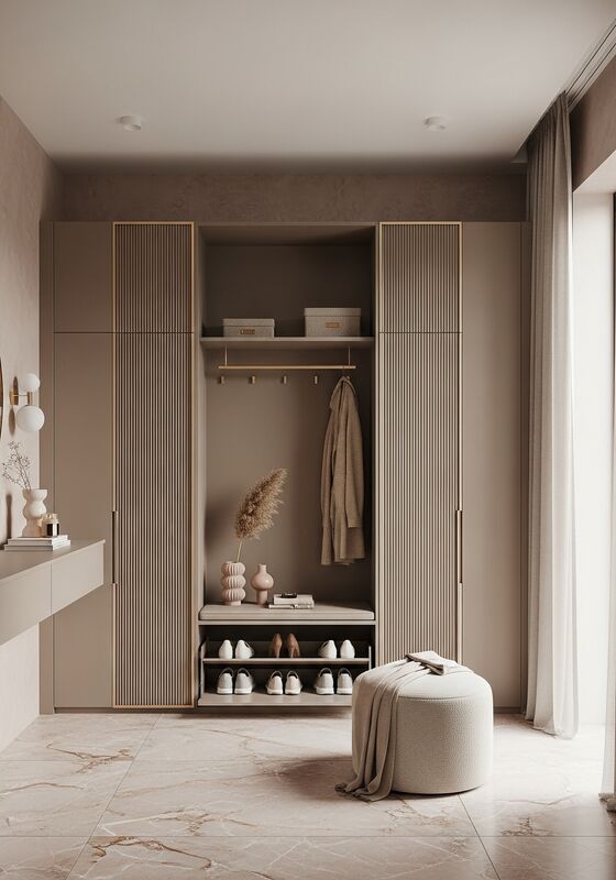 Fadior pozycjonuje tę szafę do przechowywania butów jako rozwiązanie projektowe zbudowane wokół konstrukcji ze stali nierdzewnej klasy spożywczej 304 z matową powłoką purpurową (220°C pieczone),Szampana złoto powlekane pvd ramy ze stali nierdzewnej ujawnia, panele szafy na bazie stali z matowym lakierem, oraz dopasowana powierzchnia z kamienia lub stali do wejścia do mieszkania, garderoby lub korytarza sypialni;przeznaczone do 12-16 par z regulowaną półkąTa specyfikacja koncentruje się na pionowych mikro-fluted lacki taupe drzwi na 15 mm pitch tworząc subtelny rytm cienia,Konstrukcja ze stali nierdzewnej 304 z ciepłą matową powłoką w kolorze grzyba, sprzedawcy i nabywcy projektów mogą ocenić logikę dopasowania, wykończenia i dostawy z mniejszą ilością zgadywań.