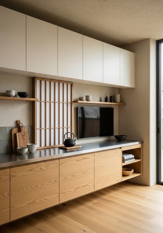 | Najważniejsze elementy projektuZastrzeżony japoński minimalizm z ciepłem materiału wabi-sabi, dominacją dębu o prostych ziarnach, ciepłymi białymi recesyjnymi elementami, cienkimi ciemnymi akcentami strukturalnymi,kierunek integracji miękkiego rozproszonego oświetlenia z naturalnym miodem dębowym (podstawowy), ciepła pergaminowa biała (powierzchnie wtórne), czarne żelazo (akcent konstrukcyjny), ciepła glina szara (opcjonalnie półka ceramiczna), zdyscyplinowane proporcje,i naturalnego japońskiego fałdu dębowego na 304 stali nierdzewnej rdzeniu konstrukcyjnymStrona powinna być odczytywana jako specyfikacja rozstrzygnięta, a nie ogólna skrzynka pamięci masowej. |